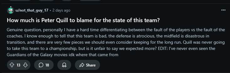 The mistake isn't surprising considering the coach prior to Eric QUILL was PETER Luccin. That said, it did start my nerd brain spinning. Instead of complaining about another three points lost, lamenting another mediocre Lucho Acosta performance, or pining for a playoff run that isn't likely let's spend some time humorously. Because as a wise man once said, isn't it fun to be able to laugh a little bit?