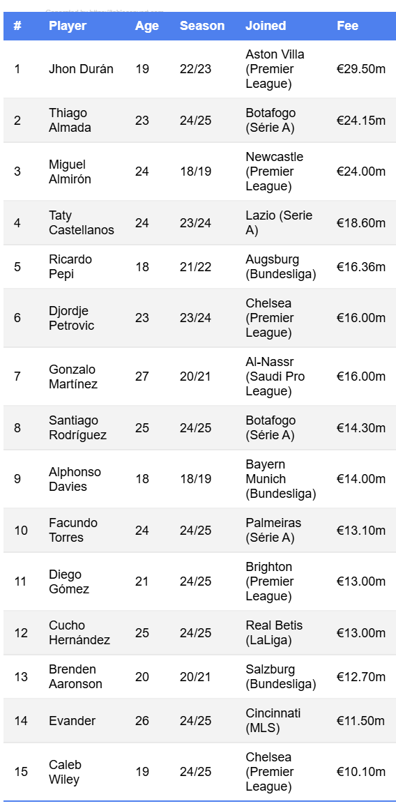 Before we can predict whether Musa will attract the above fee, we need to understand what teams have paid in the past for the league's top talents. Let's look at this handy chart, featuring the top 15 outbound transfers in MLS with data courtesy of Transfermarkt.